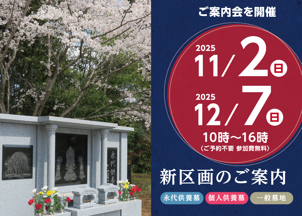 2025.10.29 榮福寺からのお知らせ 墓地案内会のお知らせ 11月2日(日)・12月7日(日) 10時より墓地無料案内会(ご予約不要)を開催します。◯事前申し込みは必要ございませんので、お気軽にご参加ください。◯どなたでもご参加いただけます。